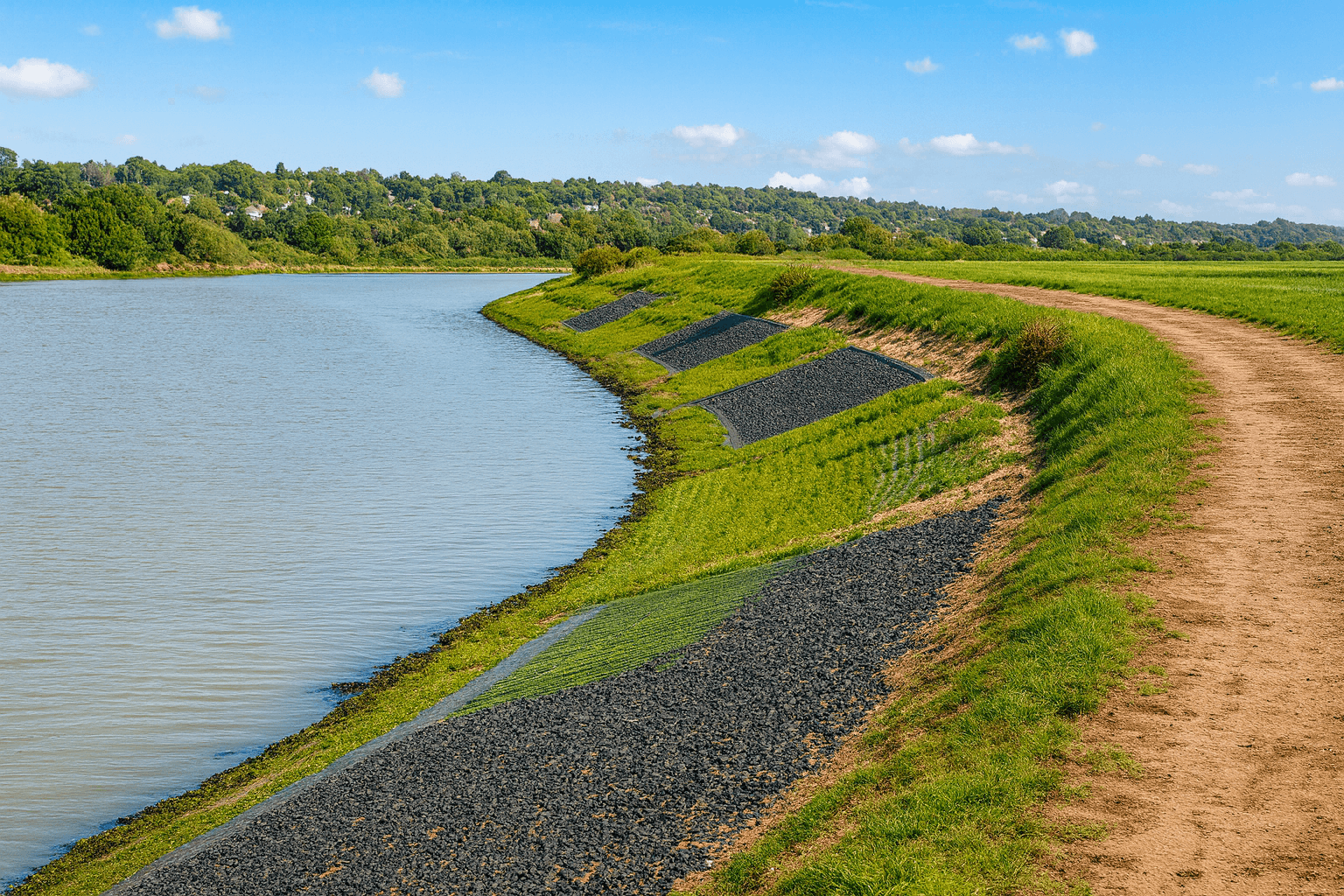 In the 2014 phase, the slope was re-profiled and a new toe formed within the existing embankment. A 150mm layer of Open Stone Asphalt (OSA) was placed over a 150mm filter layer of Lean Sand Asphalt (LSA) to stabilise the structure, with irregular top edges sealed using hot-poured mastic to ensure water-tightness and durability.